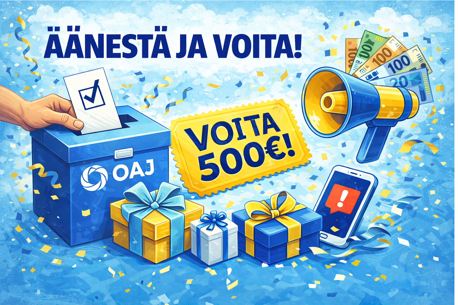 Valtuustovaalien äänestys tapahtuu sähköisesti ja äänestysaika on 17–30.3.2026. Äänestämällä heti ensimmäisenä äänestyspäivänä, osallistut jokaisena äänestyspäivänä 500 euron lahjakortin arvontaan (OAJ:n järjestämä arvonta). Tärkeää on, että äänestät!